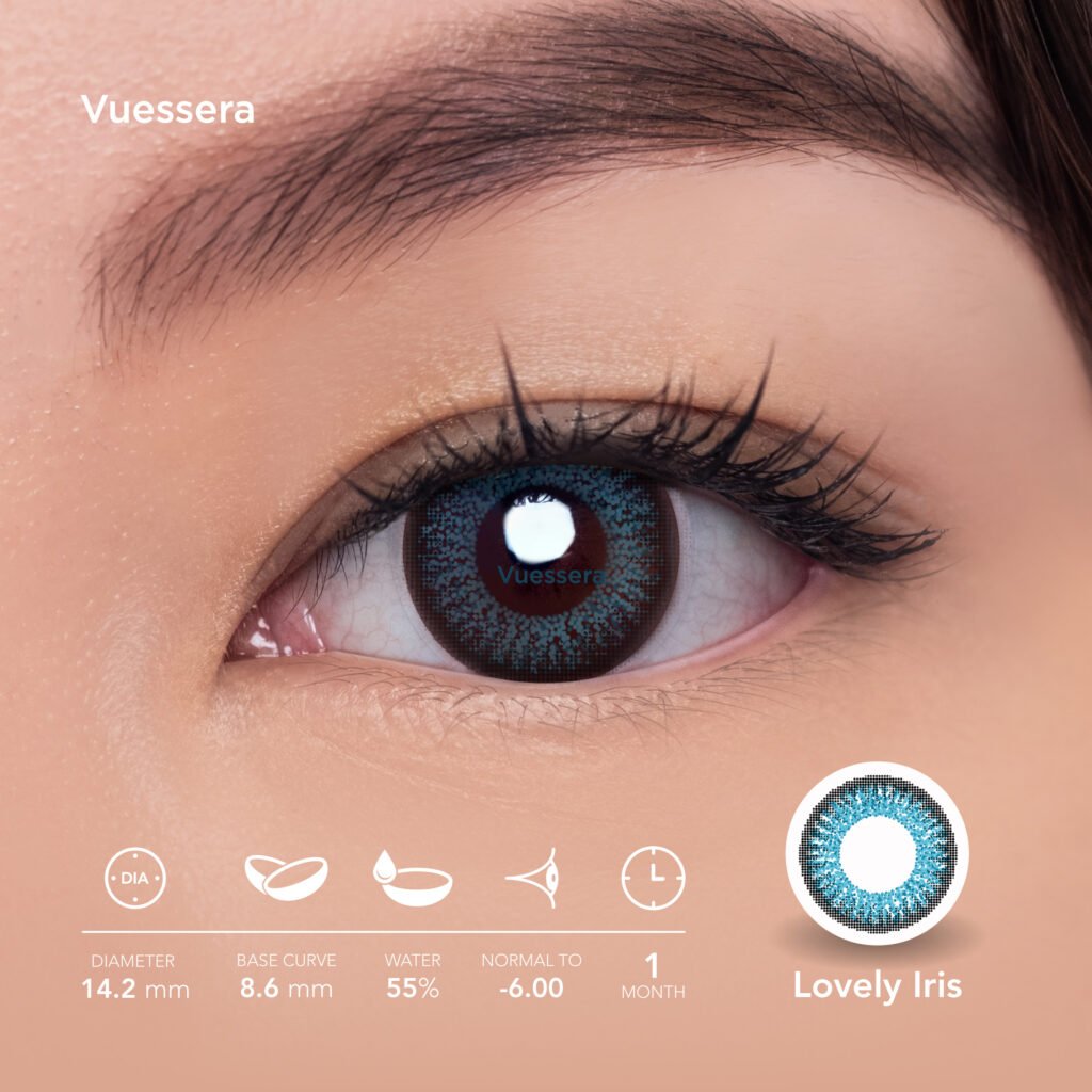 Lovely Iris : Warna biru yang dilengkapi oleh ring coklat membuat mata kamu terlihat lebih besar dan berbinar, cocok digunakan untuk acara semi formal dan formal.