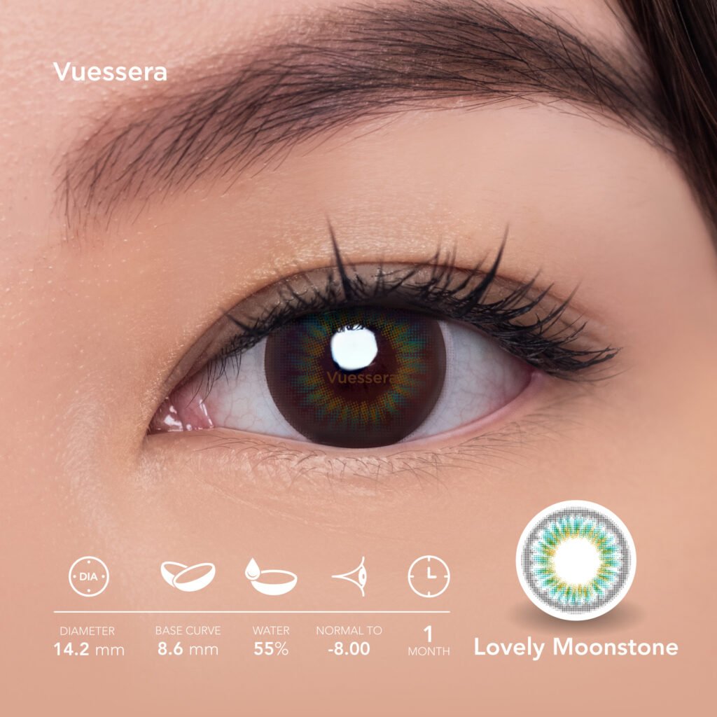 Lovely Moonstone: Pattern warna kuning, biru dan sedikit ring tipis pada lingkaran softlens membuat mata kamu menjadi lebih berbinar dan cantik, cocok digunakan untuk acara semi formal dan formal.