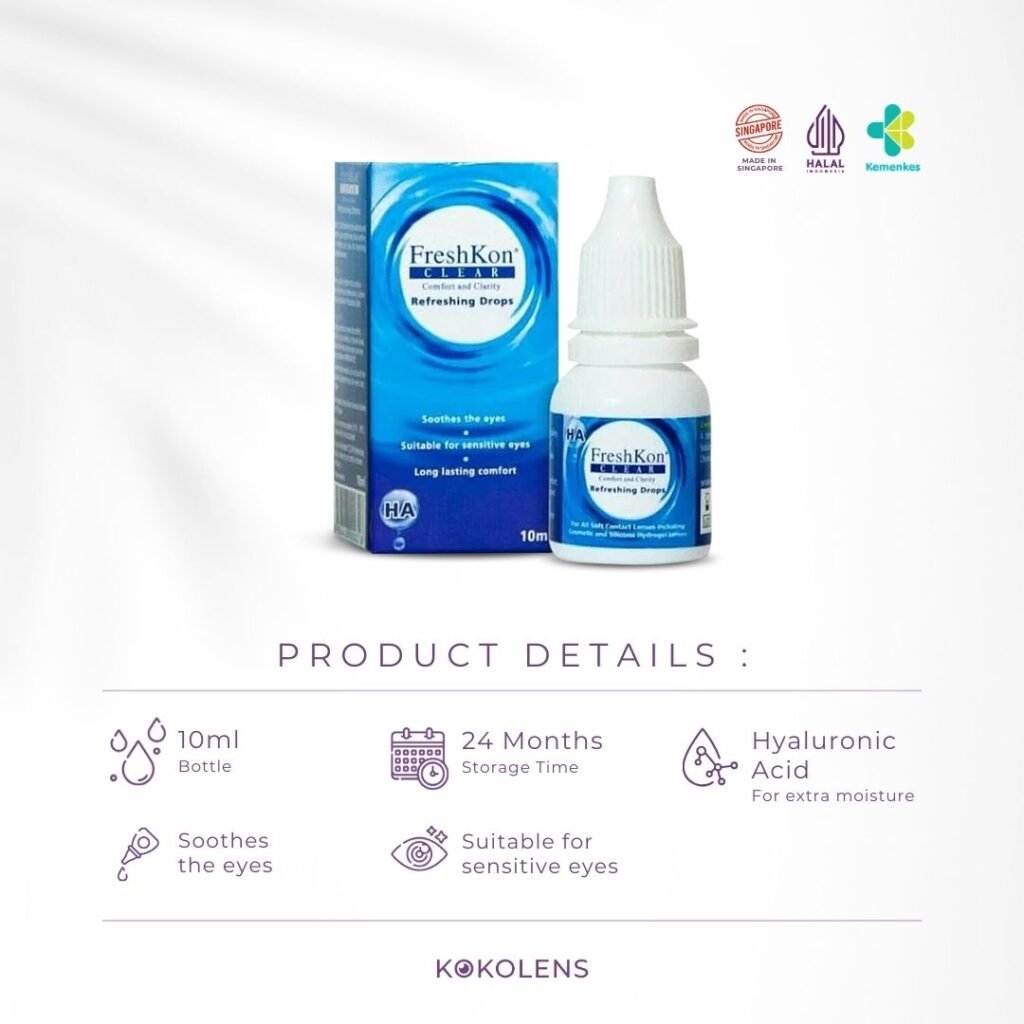 Refreshing eye drops adalah cairan tetes mata yang digunakan untuk melembabkan lensa kontak ketika dipakai, sehingga menyejukkan dan menyegarkan mata untuk pemakaian lensa kontak lebih nyaman dan tahan lebih lama. Mengandung HA (Hyaluronic Acid) untuk mengoptimalkan lubrikasi dan hidrasi pada mata, sehingga meningkatkan kenyamanan dan kejernihan mata.